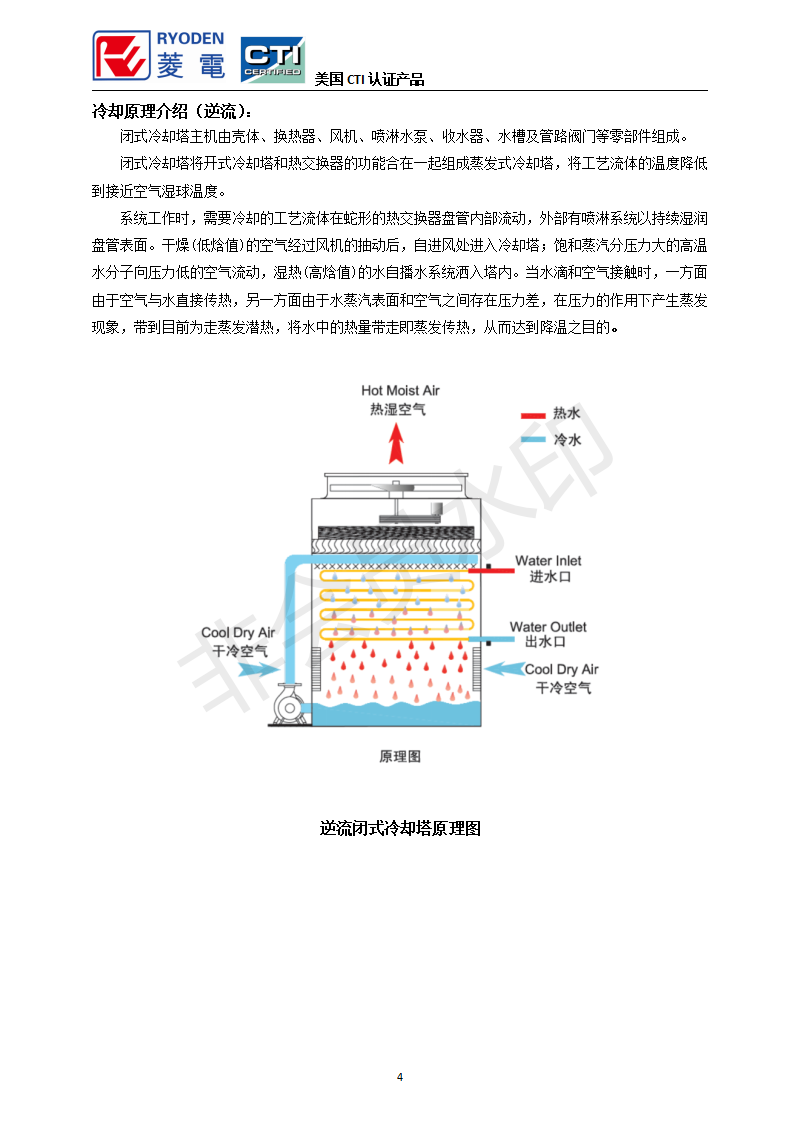 2.干燥的空氣由底部的入風網進入到塔內的,然后和熱水進行熱交換,成為高濕度的熱風從頂部出來,冷卻稱水滴經過水管進入主機。